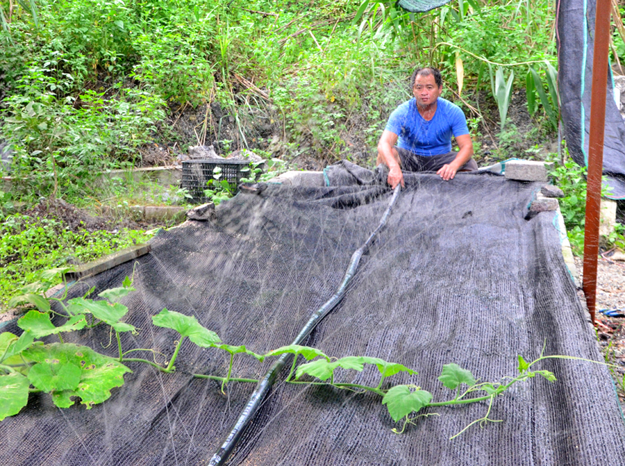 | Anh Tuyến phủ lưới đen và phun nước làm mát cho các luống giun quế. |
