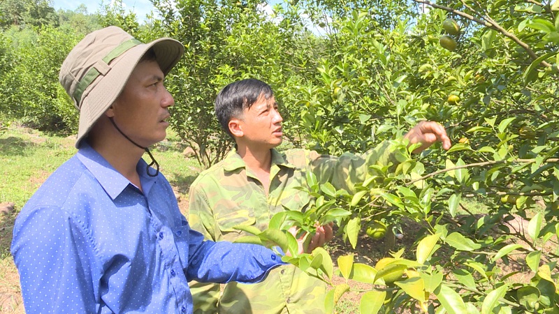 | Anh Kiều Văn Tùng, thôn Nà Na, xã Bản Sen (bên phải) chăm sóc vườn cam của gia đình. |