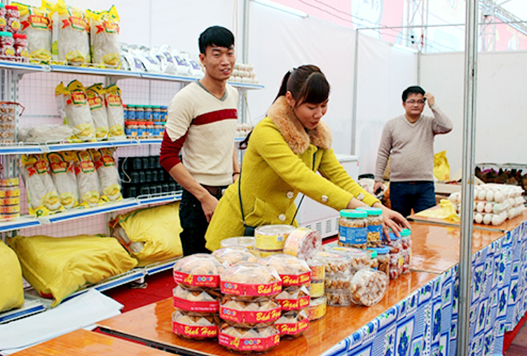 | Sản phẩm kẹo lạc hồng cùng các sản phẩm OCOP khác của huyện Tiên Yên được bày bán tại Hội chợ OCOP Quảng Ninh Xuân 2016. Ảnh: Thu Chung (CTV) |