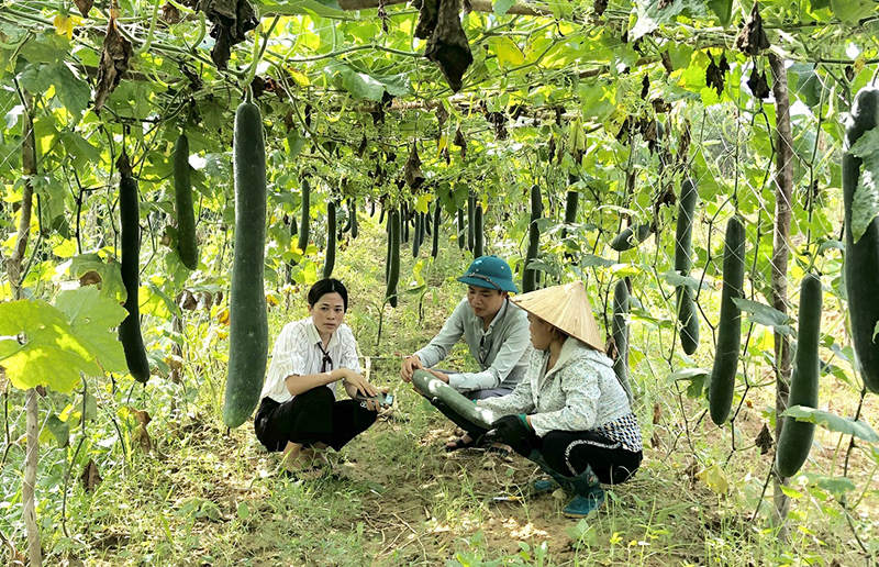 | Cán bộ Hội LHPN xã Đông Hải khảo sát mô hình trồng bí sặt của hộ chị Từ Thị Cúc (thôn Nà Bấc, xã Đông Hải, huyện Tiên Yên). |
