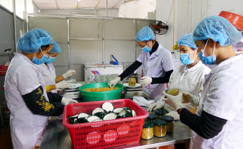 | Công nhân Công ty TNHH sản xuất và thương mại thủy sản Quảng Ninh đóng gói sản phẩm ruốc hàu. |