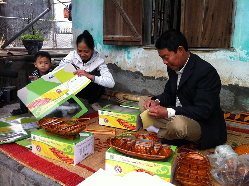 | Các hộ tham gia chương trình OCOP được hỗ trợ về thiết kế bao bì, mãn nhác cho sản phẩm OCOP. Trong ảnh: Người dân xã Nam Hoà, TX Quảng Yên sản xuất thuyền nan. |