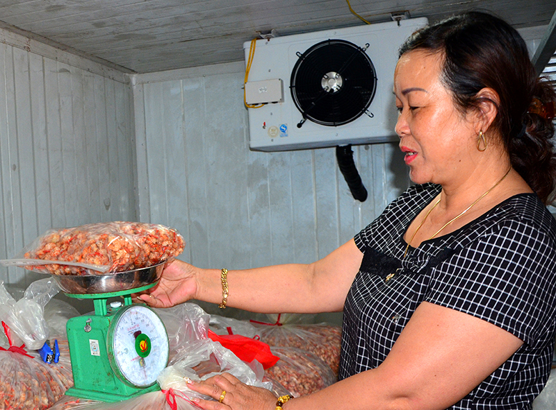 | Tôm khô sau khi được chế biến được chị Liên đưa vào kho lạnh bảo quản rồi mới xuất bán. |